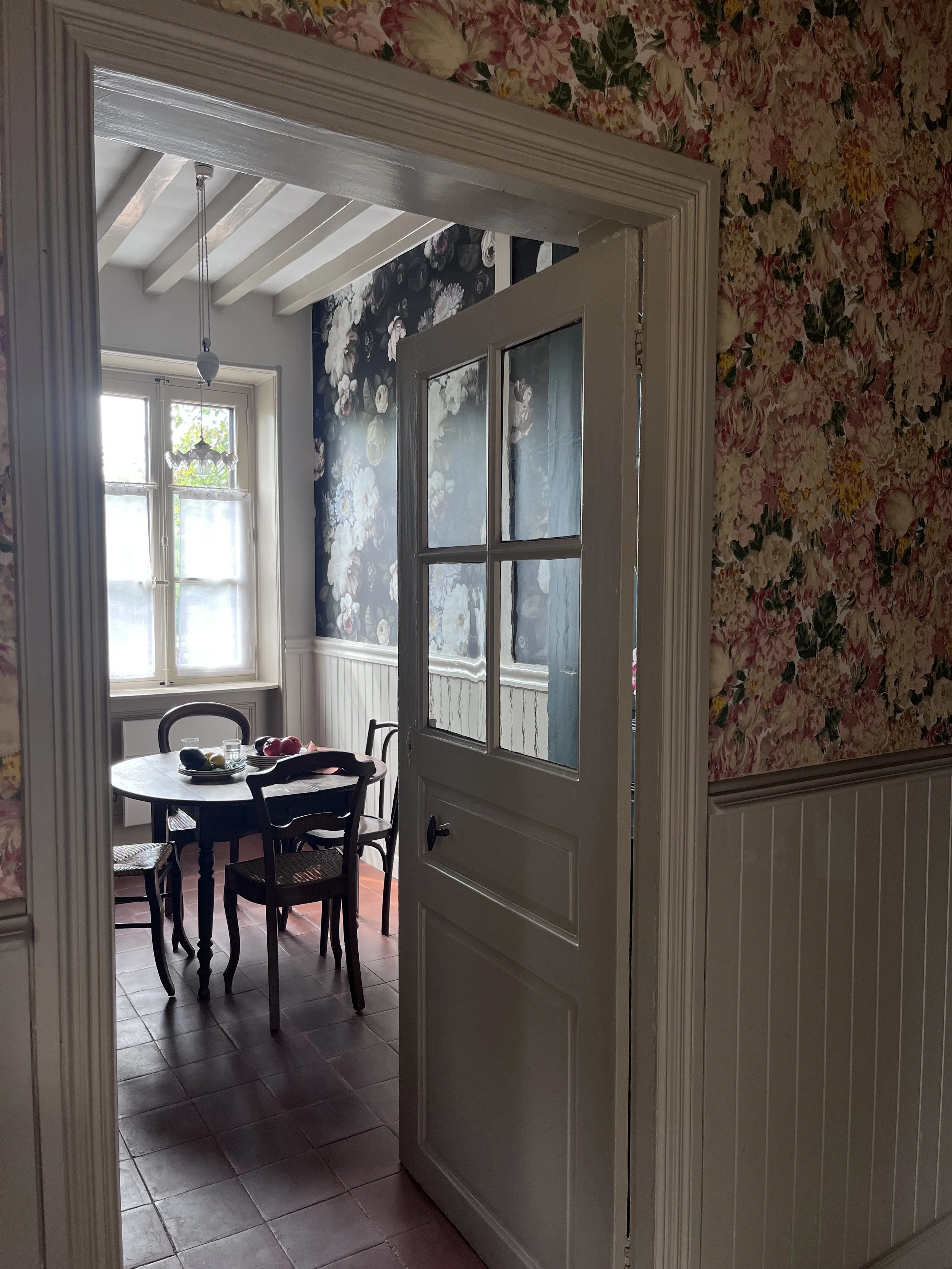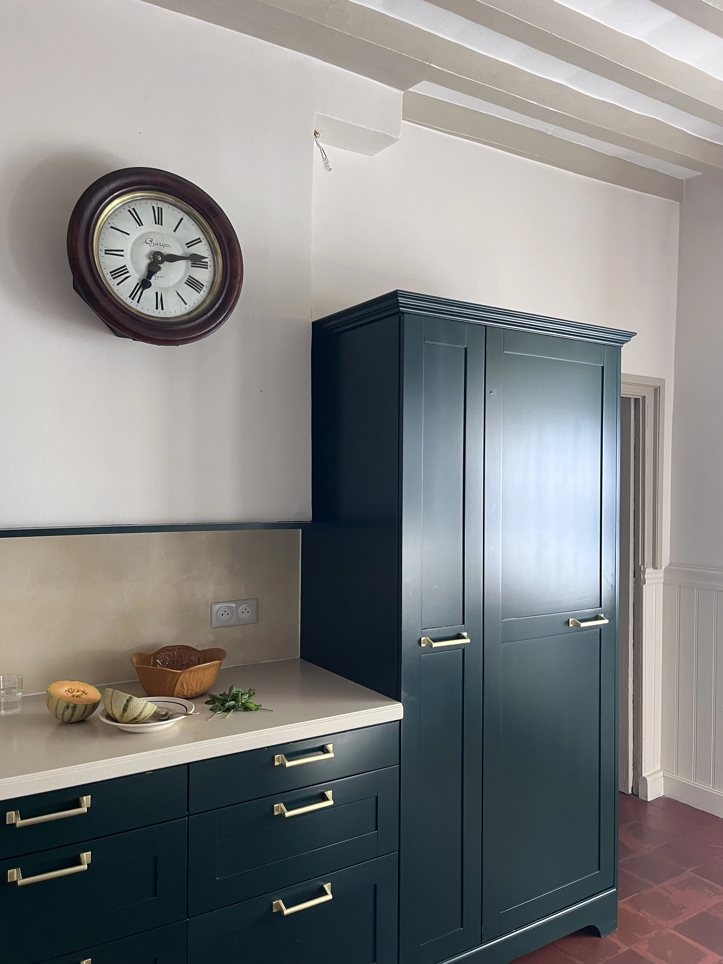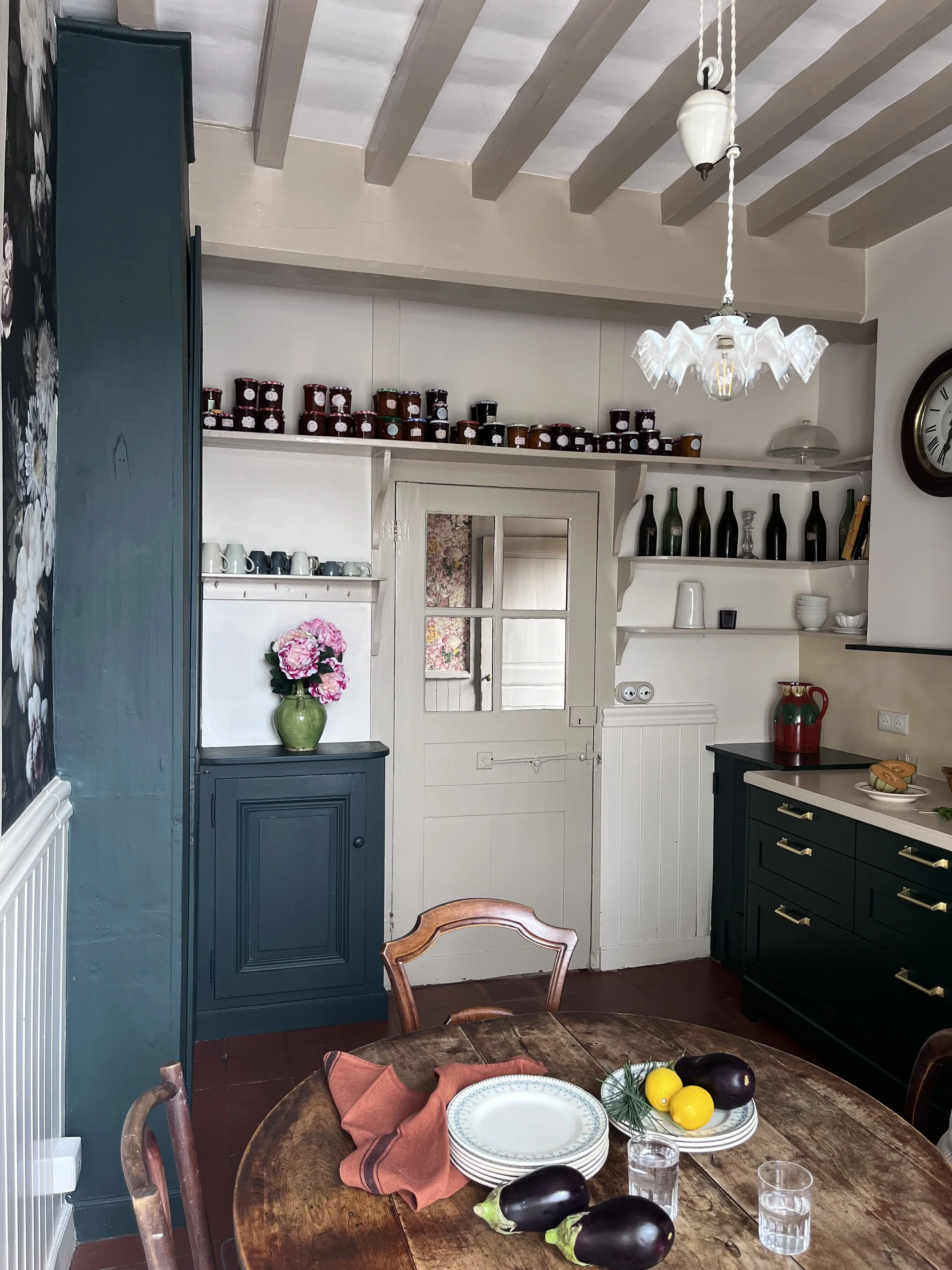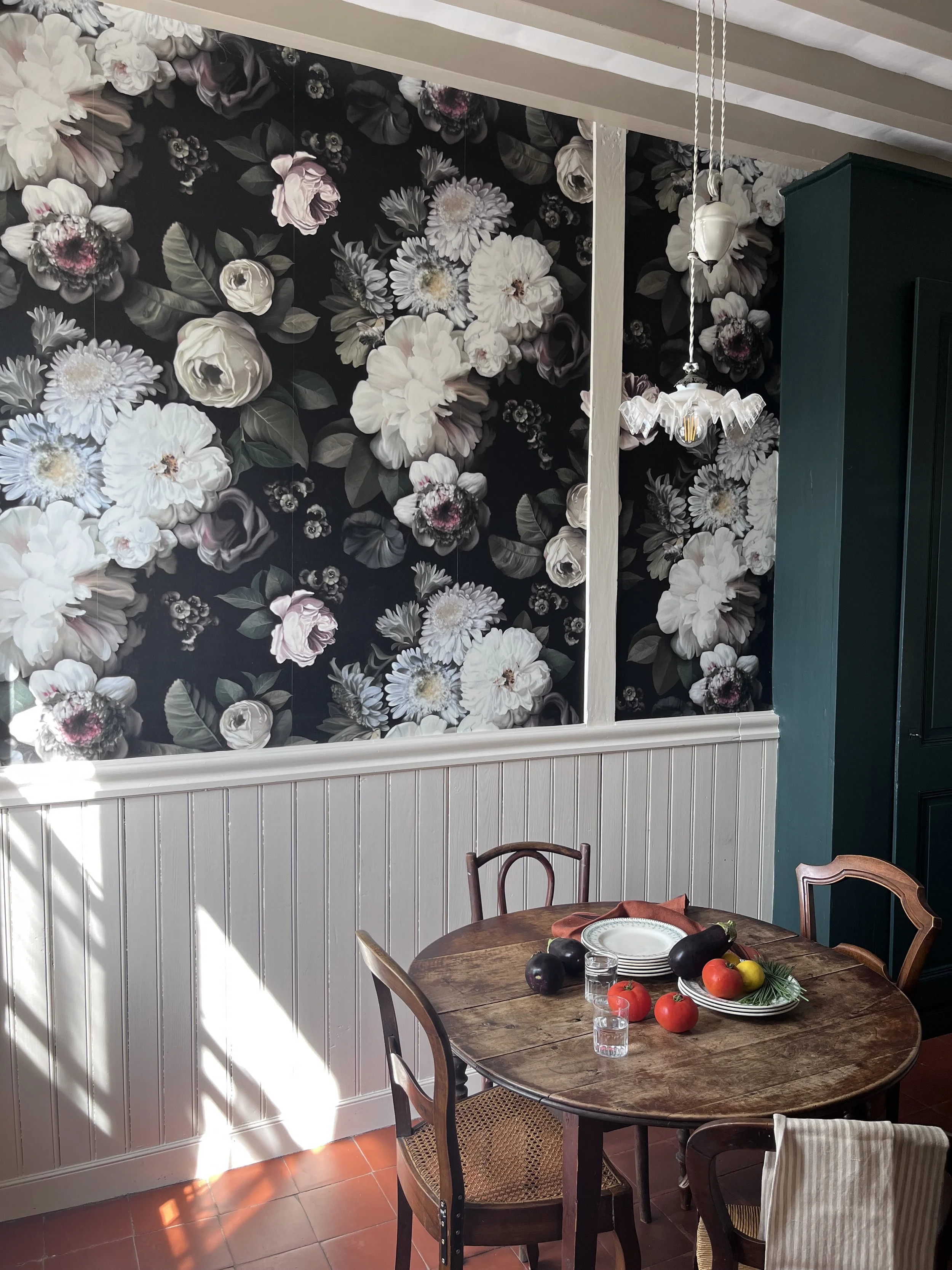 Située près de l’Arbresle, cette demeure de 1780 accueille depuis plusieurs générations la même famille, qui prend plaisir à s’y rendre régulièrement. Une première phase de travaux a donc consisté à moderniser la cuisine, cœur de cette maison. Faisant écho au papier peint existant de l’entrée, très bien conservé, le décor floral d’Ellie Cashman vient prendre place dans la pièce principale de cette cuisine. L’ancienne cheminée a été déposée au profit de nouveaux rangements, beaucoup plus pratiques. Toute la pièce reprends différentes nuances de verts : un vert foncé, soutenu, pour la cuisine, et une teinte plus acidulée pour la souillarde. Le plan de travail est en résine effet quartz, et la crédence en béton ciré. L’ensemble des meubles a été réalisé sur mesure par un menuisier local. Enfin, les toilettes ont également connu un coup de pep’s !
