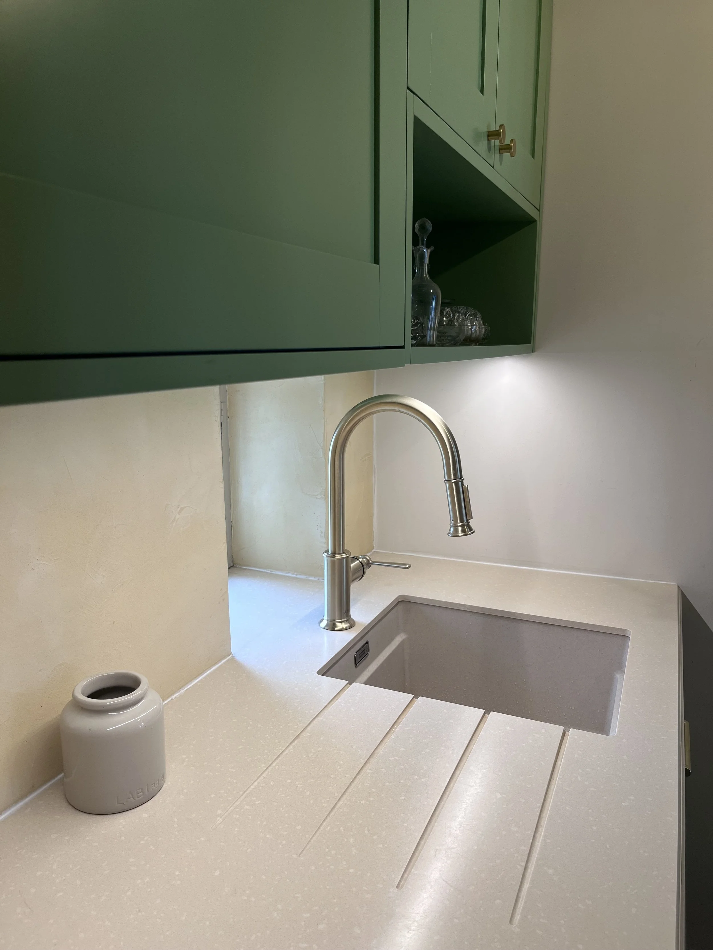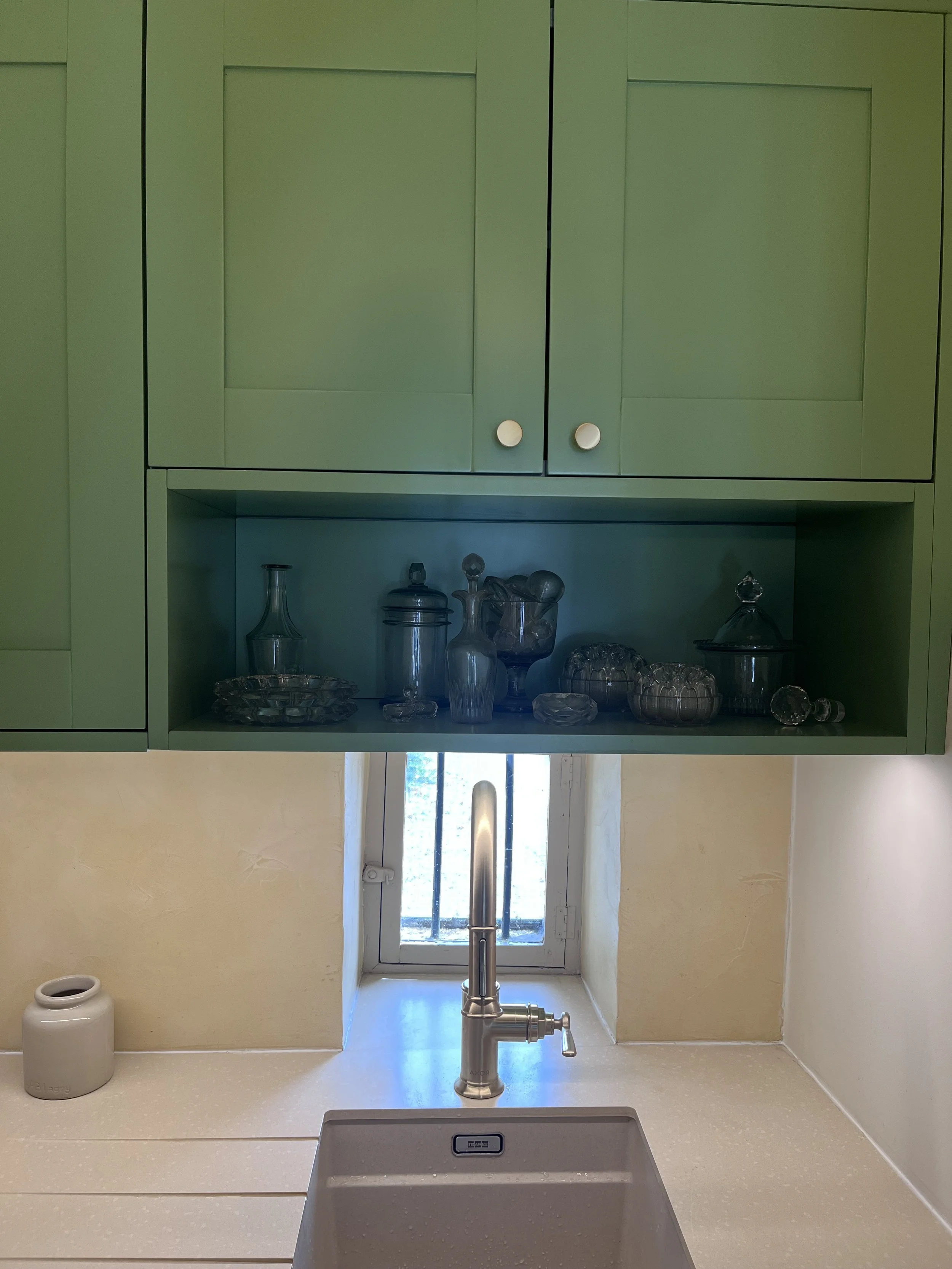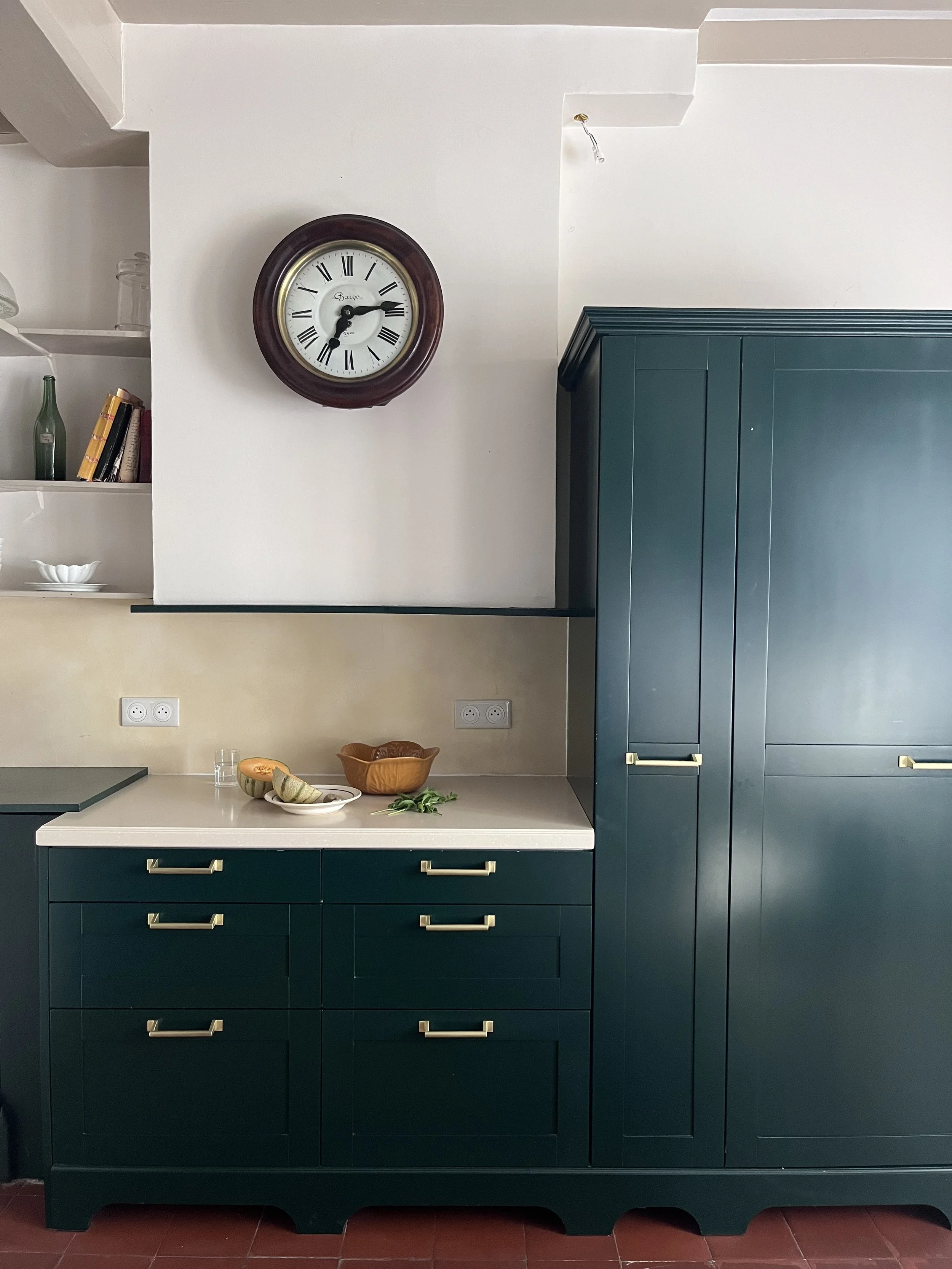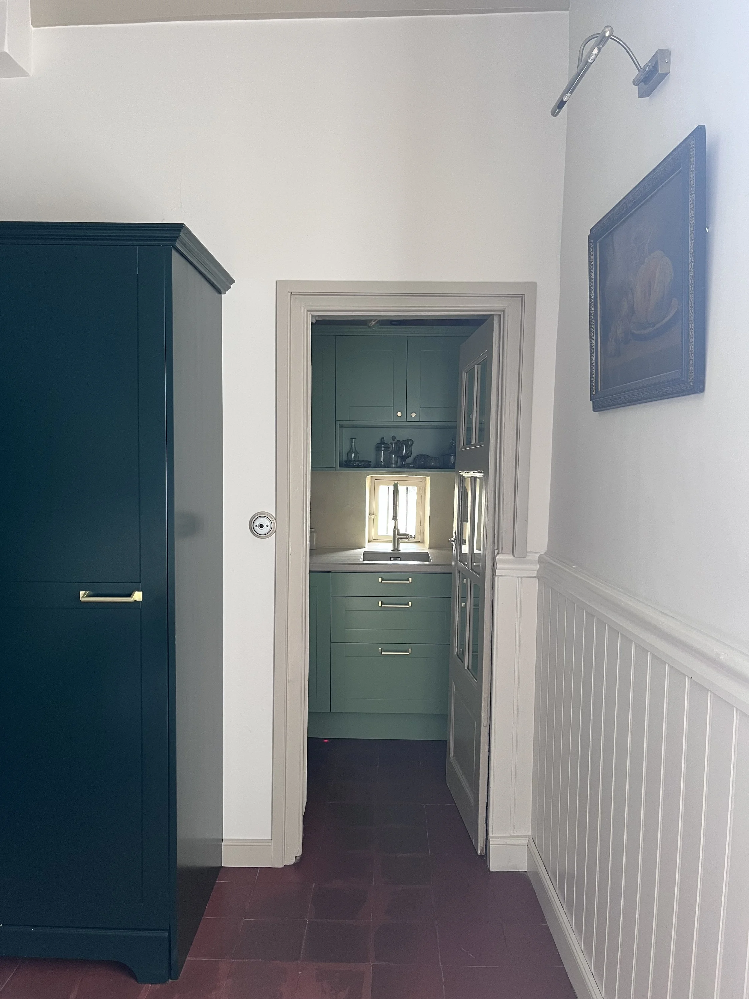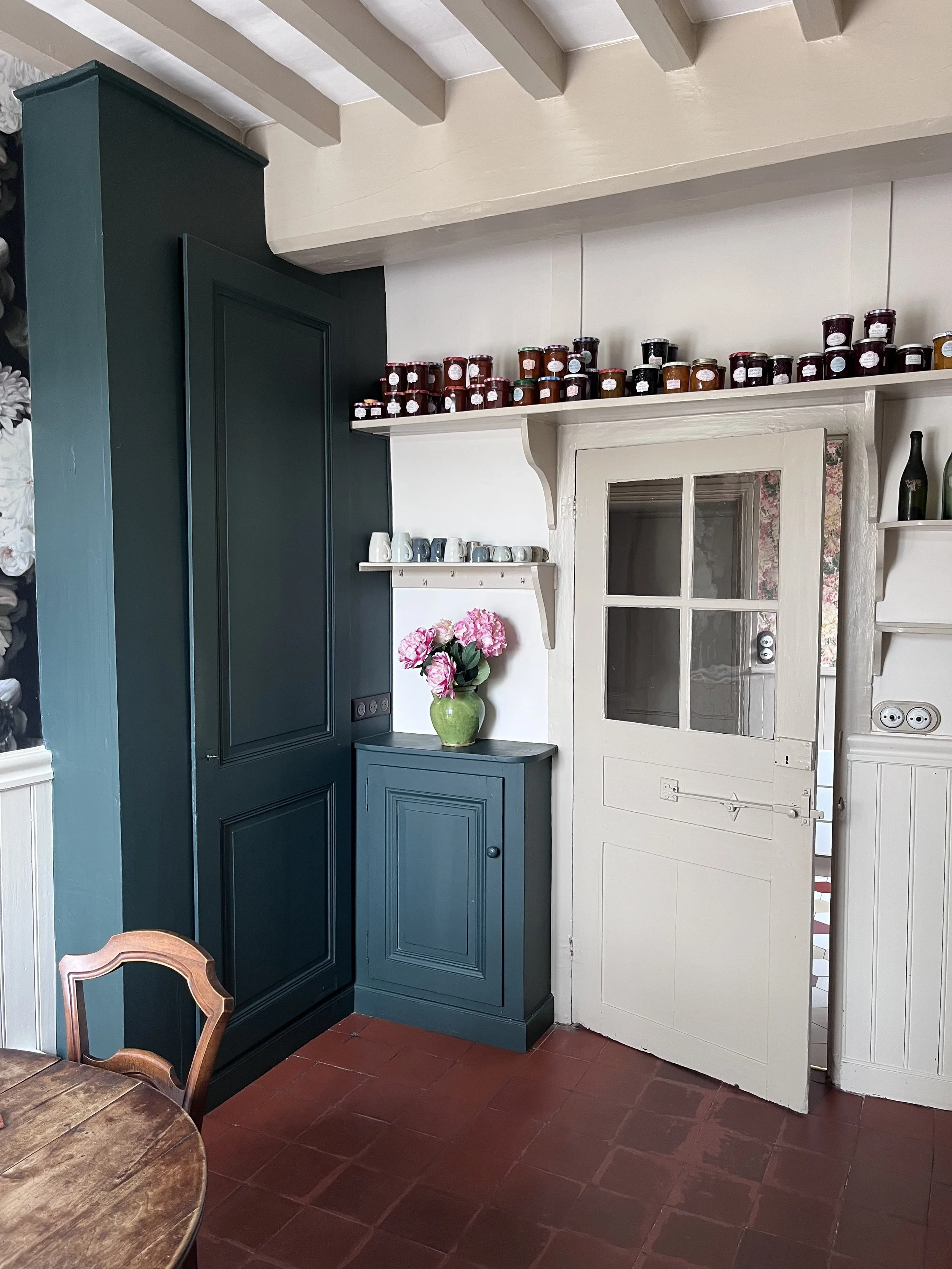 Située près de l’Arbresle, cette demeure de 1780 accueille depuis plusieurs générations la même famille, qui prend plaisir à s’y rendre régulièrement. Une première phase de travaux a donc consisté à moderniser la cuisine, cœur de cette maison. Faisant écho au papier peint existant de l’entrée, très bien conservé, le décor floral d’Ellie Cashman vient prendre place dans la pièce principale de cette cuisine. L’ancienne cheminée a été déposée au profit de nouveaux rangements, beaucoup plus pratiques. Toute la pièce reprends différentes nuances de verts : un vert foncé, soutenu, pour la cuisine, et une teinte plus acidulée pour la souillarde. Le plan de travail est en résine effet quartz, et la crédence en béton ciré. L’ensemble des meubles a été réalisé sur mesure par un menuisier local. Enfin, les toilettes ont également connu un coup de pep’s !