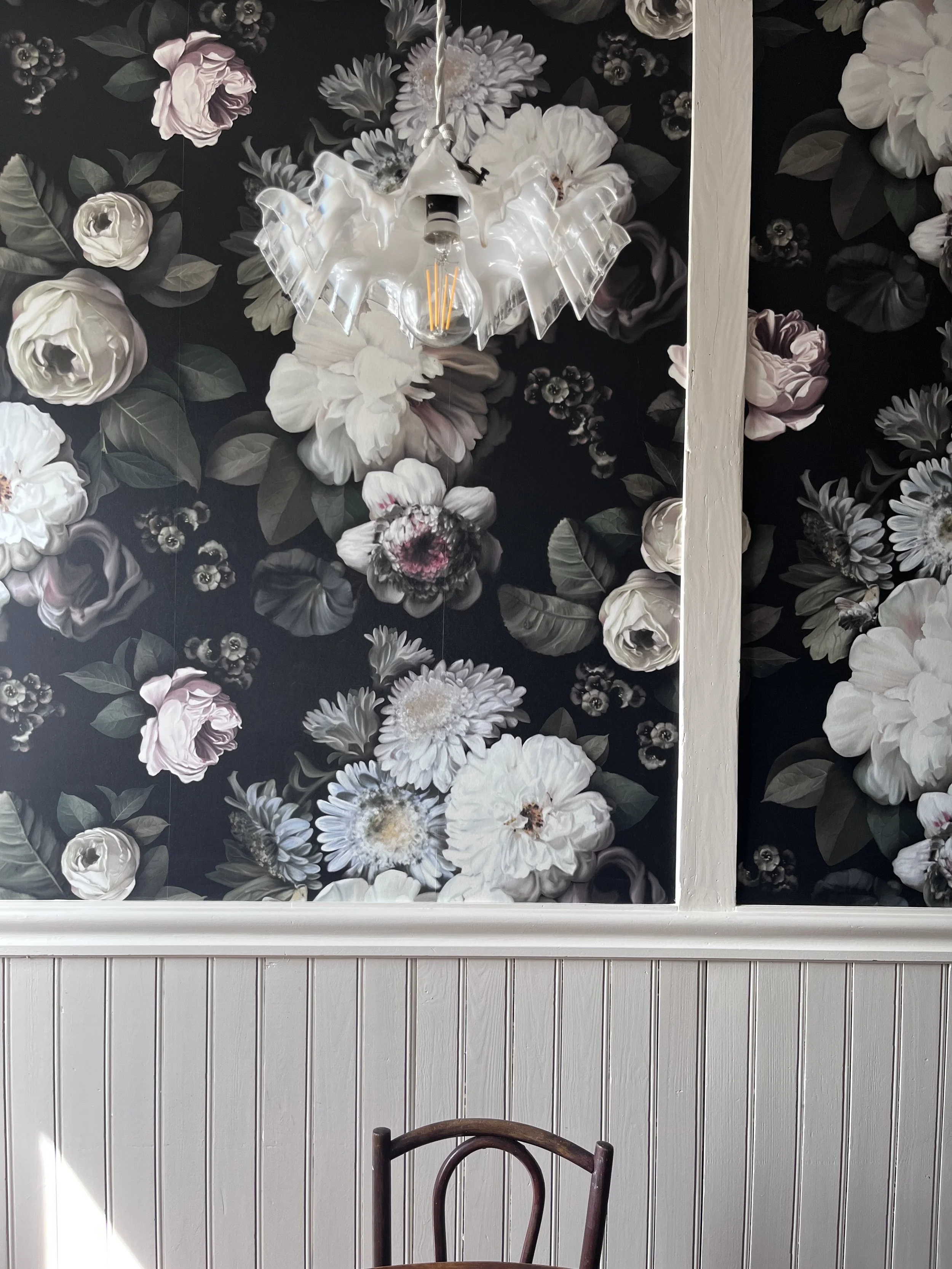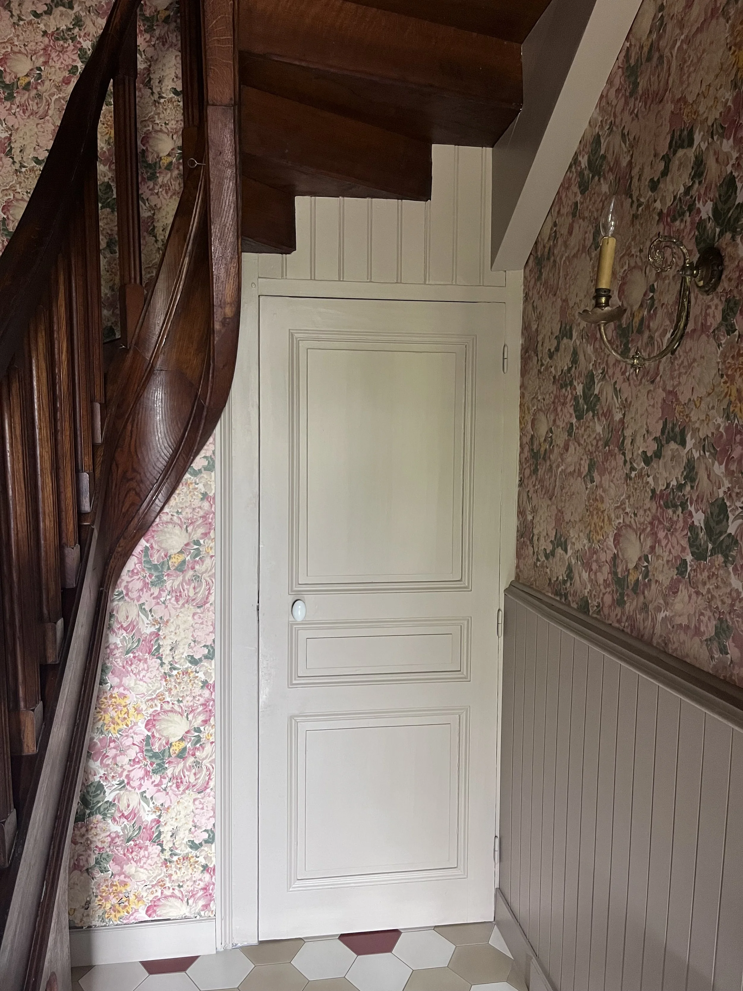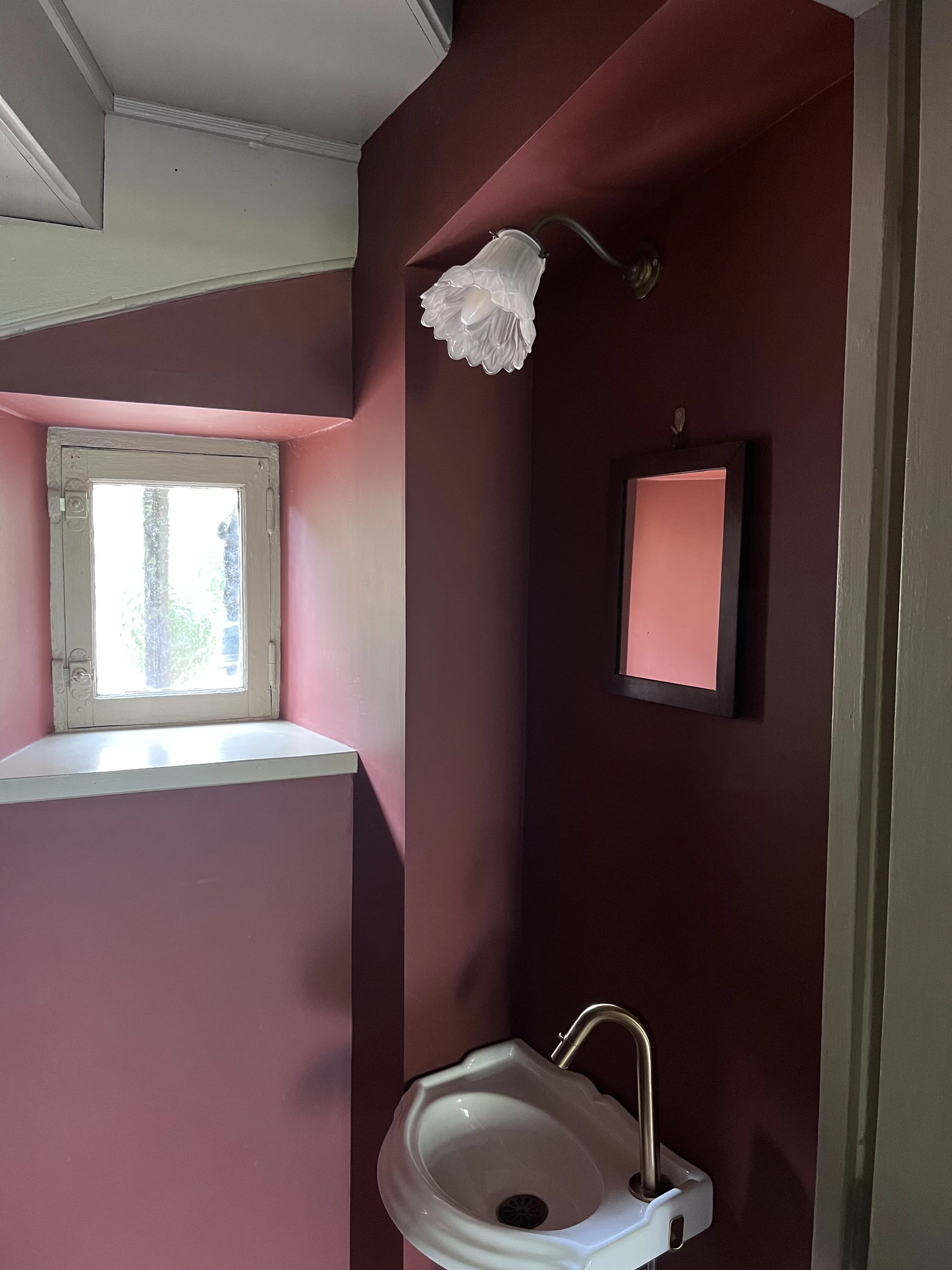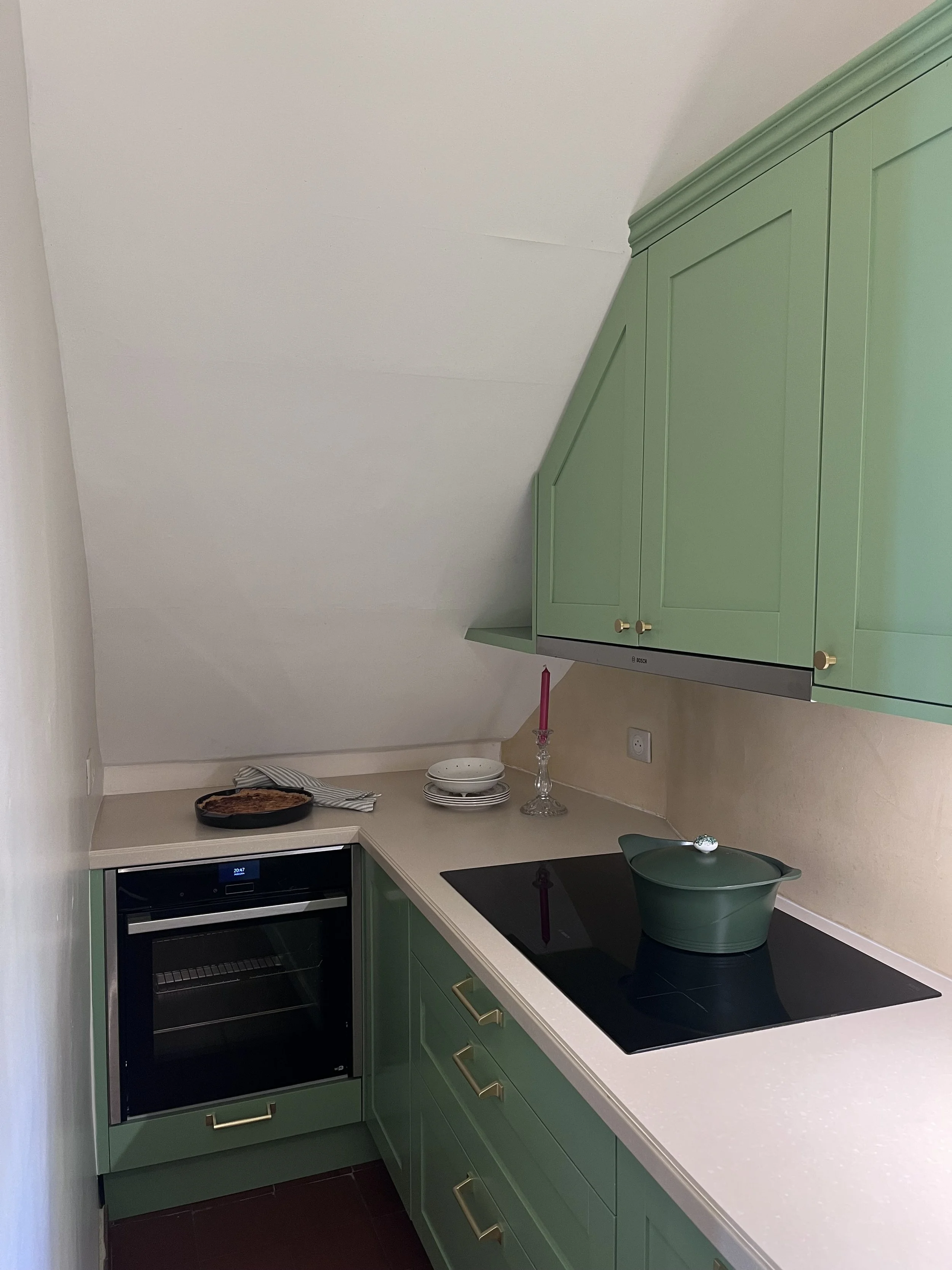 Située près de l’Arbresle, cette demeure de 1780 accueille depuis plusieurs générations la même famille, qui prend plaisir à s’y rendre régulièrement. Une première phase de travaux a donc consisté à moderniser la cuisine, cœur de cette maison. Faisant écho au papier peint existant de l’entrée, très bien conservé, le décor floral d’Ellie Cashman vient prendre place dans la pièce principale de cette cuisine. L’ancienne cheminée a été déposée au profit de nouveaux rangements, beaucoup plus pratiques. Toute la pièce reprends différentes nuances de verts : un vert foncé, soutenu, pour la cuisine, et une teinte plus acidulée pour la souillarde. Le plan de travail est en résine effet quartz, et la crédence en béton ciré. L’ensemble des meubles a été réalisé sur mesure par un menuisier local. Enfin, les toilettes ont également connu un coup de pep’s !